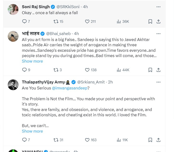 मेकर्स के इस जवाब पर यूजर्स ने उन्हीं की क्लास लगा दी है। एक ने लिखा, 'आपका आर्ट फॉर्म गलत है...ये बात संदीप, जावेद अख्तर साब को कह रहे हैं...तीन फिल्में बनाकर एरोगेंस आ गया है...संदीप की जरूरत से ज्यादा प्राइड बढ़ गई है...समय सबका साथ देता है। लोग अच्छे समय में आपके साथ खड़े होते हैं। बुरा समय भी आएगा, जो लोग आपके साथ थे, वह आपको ट्रोल कर रहे होंगे।'