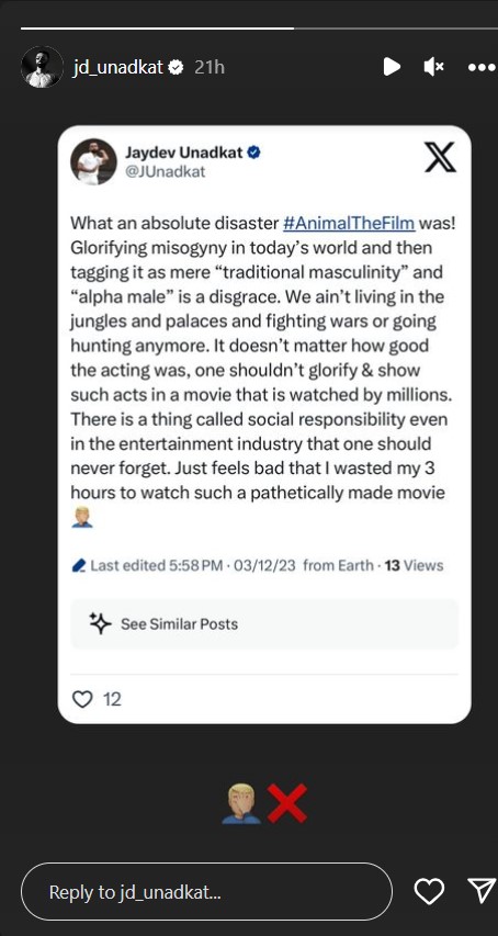 जयदेव उनादकट ने एक्स (ट्विटर) पर एनिमल का रिव्यू लिखा। इस पोस्ट के स्क्रीनशॉट को उन्होंने अपनी इंस्टा स्टोरी में भी शेयर किया। क्रिकेटर ने कहा, "एनिमल कितनी ज्यादा बकवास फिल्म है। आज के दौर में मिसोजिनी को बढ़ावा दिया जा रहा है और फिर इसे मर्दानगी और अल्फा मेल का टैग दिया जा रहा है। अब हम जंगल और महलों में नहीं रहते हैं और न ही शिकार करने जाते हैं।"