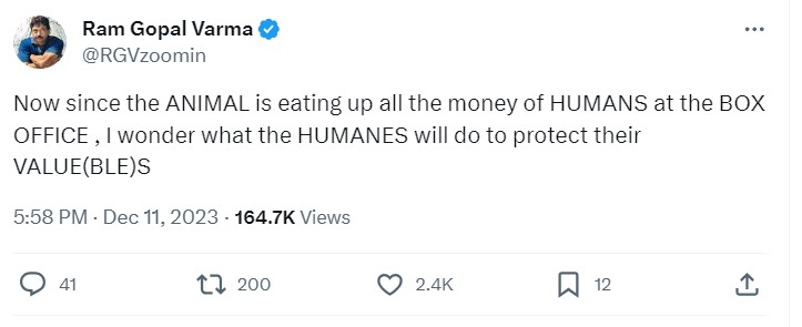 राम गोपाल वर्मा ने इसके अलावा सोशल मीडिया पर एनिमल के लिए एक और पोस्ट शेयर किया है। जिसमें उन्होंने कहा, "अब जब एनिमल बॉक्स ऑफिस पर लोगों के सारे पैसे खा रही है, ऐसे में मैं सोच रहा हूं कि ह्यूमन्स अपने संस्कारों को बचाने के लिए क्या करेंगे।"