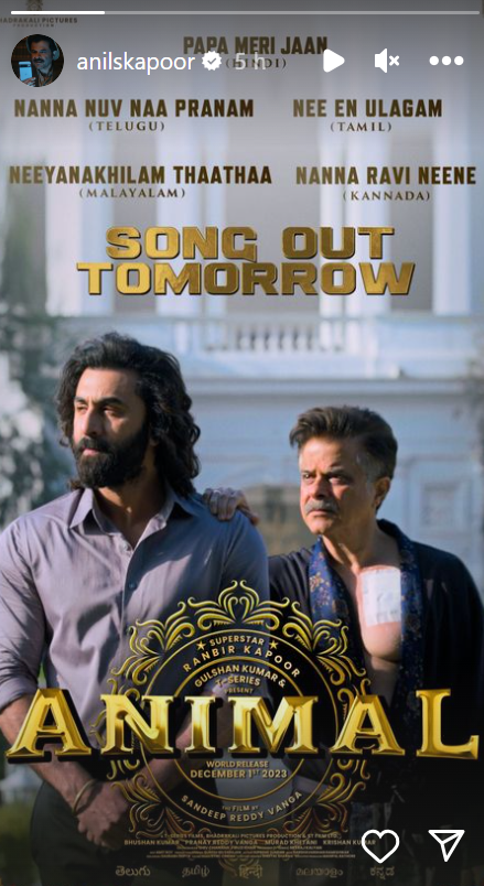 'एनिमल' का यह तीसरा गाना 'पापा मेरी जान' होगा। इस गाने में अनिल कपूर और रणबीर कपूर की बॉन्डिंग देखने को मिलेगी। अनिल कपूर ने फैंस के साथ इस बात की घोषणा की है।