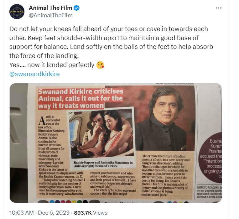 स्वानंद किरकिरे के इस बयान को एनिमल की टीम ने आड़े हाथों लिया है। एनिमल के ऑफिशियल एक्स (ट्विटर) पेज से स्वानंद किरकिरे के लिए एक क्रिप्टिक पोस्ट शेयर किया गया है, जिसमें उनके एक इंटरव्यू का स्क्रीन शॉट भी लगा है और उन्हें टैग किया गया है।