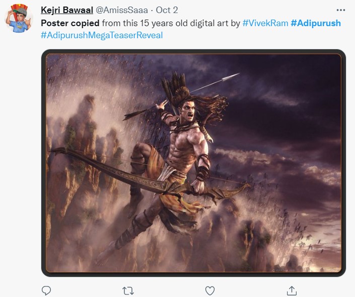 आदिपुरुष का टीजर पहले से ही विवादों से घिरा हुआ है। एनिमेशन स्टूडियो के आरोप के बाद अब मेकर्स को यूजर्स भी जमकर ट्रोल कर रहे हैं। कुछ ने स्टूडियो के क्रिएटर विवेक राम को टैग करते हुए कहा है कि आदिपुरुष मेकर्स ने उनके पोस्टर को कॉपी किया है, कम से कम इसका क्रेडिट उन्हें देना चाहिए था।