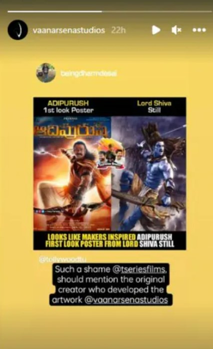 वानर सेना एनिमेशन स्टूडियो ने दावा किया है कि फिल्म आदिपुरुष के पोस्टर उनके काम की कॉपी है। टीजर के फर्स्ट लुक पोस्टर और कुछ सीन्स को उनके काम से कॉपी किया गया है। उन्होंने लॉर्ड शिवा की एक फोटो शेयर करते हुए बताया कि आदिपुरुष टीजर में जिस तरह प्रभास धनुष लिए खड़े हैं, यह बिलकुल उसी तरह है जिस तरह उनके पोस्टर में शिवा खड़े हैं। इंस्टाग्राम पर पोस्ट शेयर करते हुए इस स्टूडियो ने दावा किया है कि आदिपुरुष का पोस्टर उनके काम से प्रेरित होकर बनाया गया है। पोस्ट में लिखा, 'ये बहुत निराशजनक बात है कि हमारे काम को इस तरह कॉपी किया जा रहा है। प्रोड्यूसर्स को कम से कम ओरिजनल क्रिएटर का नाम देना चाहिए।'