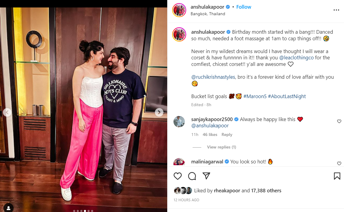 अंशुला कपूर इन दिनों बैंकॉक में छुट्टियां मना रही हैं। इस दौरान अंशुला ने सिंगर मरून का कॉन्सर्ट भी अटेंड किया और मस्ती की। इस दौरान उनके साथ रोहन ठक्कर नजर आए। अंशुला ने की तस्वीरों को देखकर साफ जाहिर हो रहा है कि उन्होंने अपने इस रिश्ते पर मुहर लगा दी है। फोटो में दोनों ही एक दूसरे में खोए हुए नजर आ रहे हैं। बता दें दोनों रिलेशनशिप में हैं, लेकिन ऑफिशियली किसी ने कुछ नहीं बोला है। अंशुला ने फोटोज शेयर कर कैप्शन दिया- मेरे जन्मदिन के महीने की मजेदार शुरुआत...बहुत डांस किया...रात के एक बजे फुट मसाज की जरूरत पड़ गई ताकि दर्द भूल सकूं... कभी मैंने अपने सबसे वाइल्ड सपने में भी नहीं सोचा था कि मैं कभी कॉर्सेट टॉप पहनूंगी... और उसमें इतनी मस्ती करूंगी..।