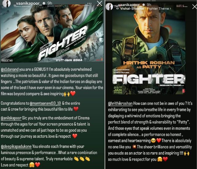 अनुपम खेर अलावा एक्ट्रेस वाणी कपूर ने अपने ऑफिशियल इंस्टाग्राम हैंडल पर स्टोरी में फाइटर को लेकर लंबा-चौड़ा नोट लिखा है- सिद्धार्थ आनंद आप वास्तव में जीनियस हैं। जिस तरह से आपने इस मूवी को तैयार किया है, वह वाकई देखने लायक है। फिल्म के देखते वक्त मेरे रौंगटे खड़े हो गए, वाह क्या कमाल की मूवी है।