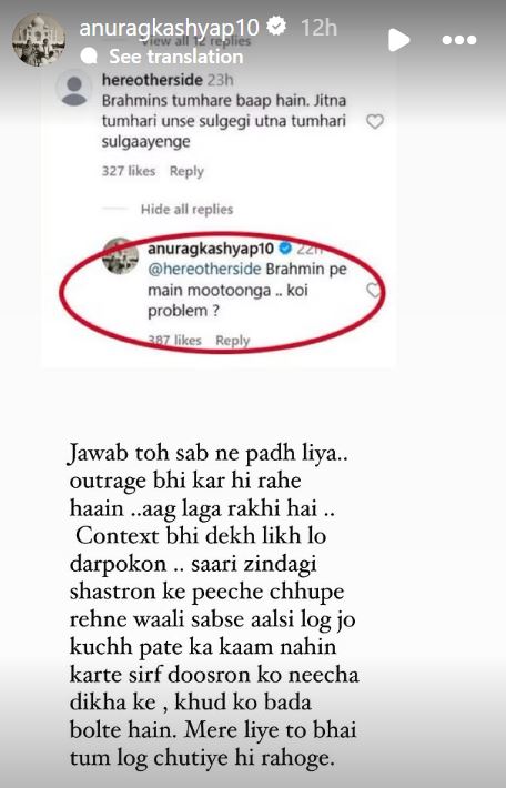 अनुराग कश्यप ने आगे कहा, "कही हुई बात वापस नहीं ली जा सकती और ना लूंगा लेकिन मुझे जो गाली देना है दो। मेरे परिवार ने ना कुछ कहा है ना कहता है। इसलिए अगर मुझसे माफी ही चाहिए तो ये मेरी माफी है। ब्राह्मण लोग औरतों को बख्श दो, इतना संस्कार तो शास्त्रों में भी है, सिर्फ मनुवाद में नहीं है। आप कौन से ब्राह्मण हो तय कर लो। बाकी मेरी तरफ से माफी।" इस पोस्ट के साथ अनुराग ने कैप्शन में लिखा, "मनुवादियों और गौर संस्कारी ब्राह्मणों के लिए माफी।"