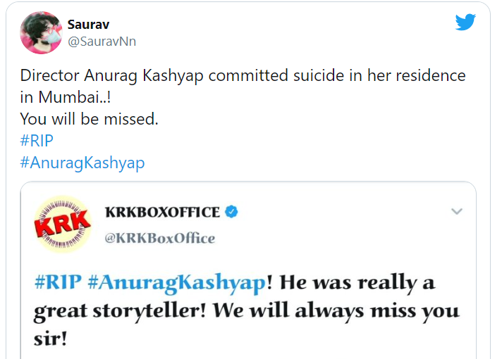 दरअसल, ट्विटर अकाउंट @KRKBoxOffice से एक ट्वीट किया गया। इसमें लिखा गया- 'अनुराग कश्यप की आत्मा को शांति मिले। वह एक बेहतरीन कहानीकार थे। हम आपको हमेशा याद करेंगे।' इसके बाद कई अन्य सोशल मीडिया यूजर्स को लगा कि अनुराग कश्यप नहीं रहे। इसमें भी कमाल की बात यह है कि एक यूजर ने इसे आत्महत्या तक बता डाला।