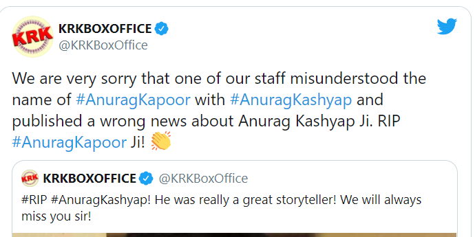 @KRKBoxOffice ने इस पर सफाई भी दी। एक अन्य ट्वीट करके उन्होंने लिखा- हमें बहुत अधिक खेद है कि हमारे एक स्टॉफ को अनुराग कश्यप और अनुराग कपूर के नाम को लेकर गलतफहमी हो गई। हमने अनुराग कश्यप को लेकर गलत न्यूज़ पब्लिस कर दी। अनुराग कपूर की आत्मा को शांति मिले!'