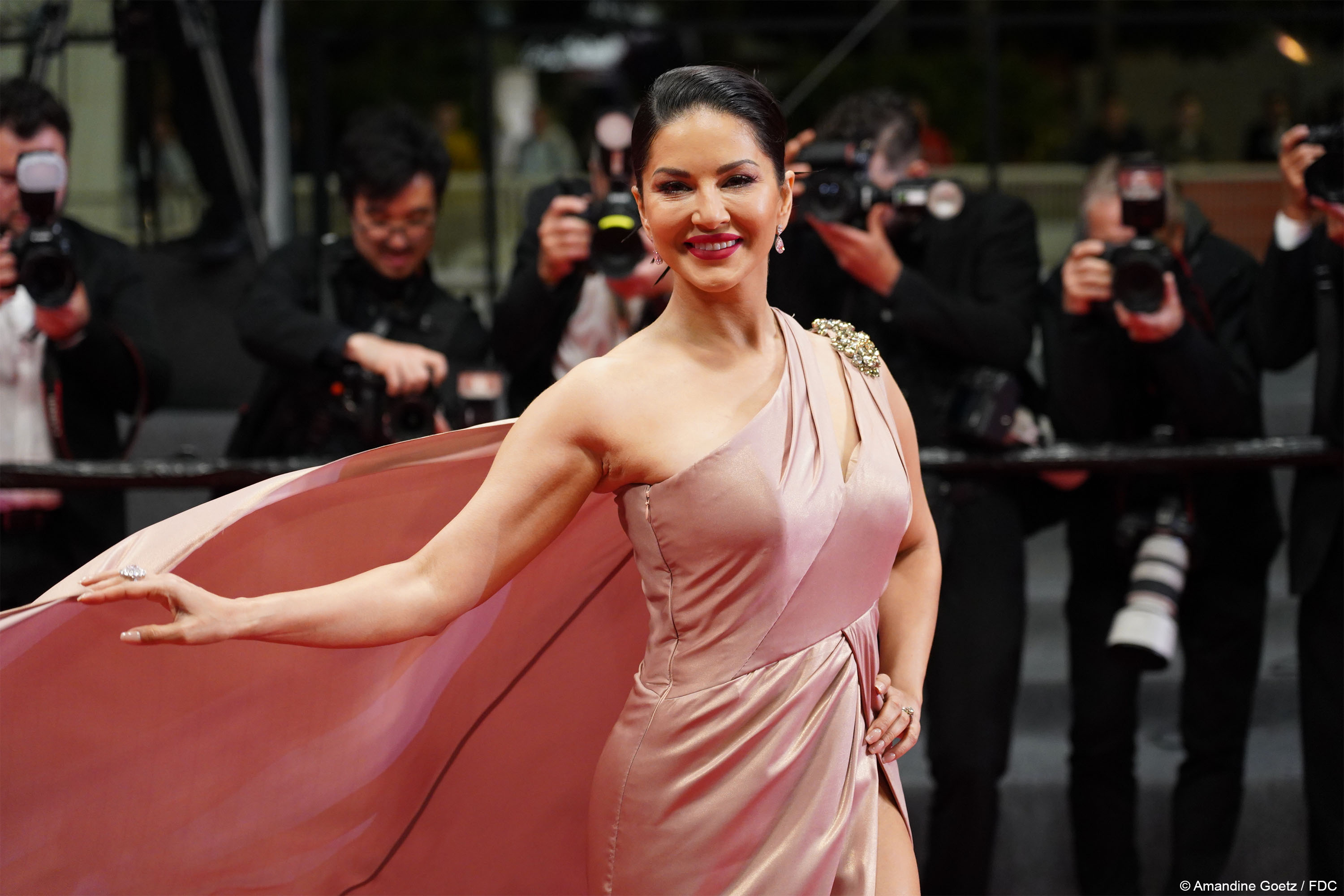 कांस 2023 में मिड नाइट स्क्रीनिंग के दौरान कैनेडी का प्रीमियर हुआ। इवेंट में शामिल होने के लिए सनी लियोनी ने खूबसूरत शैंपेन ड्रेस चुनी। लॉग स्लिट और लंबी ट्रेल वाले इस गाउन में एक्ट्रेस बला की खूबसूरत लगीं।