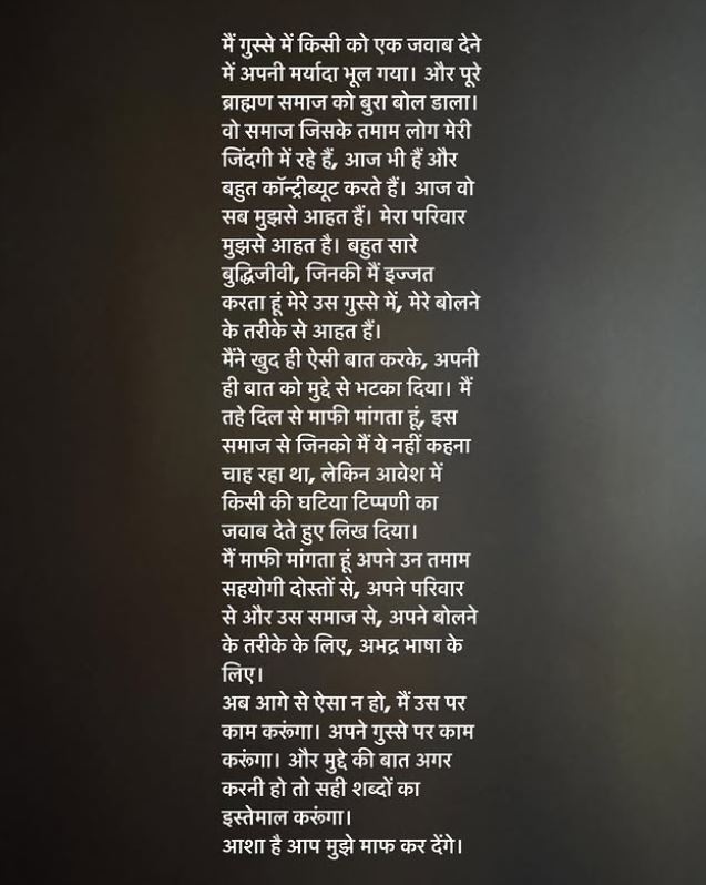 अनुराग कश्यप ने पोस्ट में कहा, "मैं गुस्से में किसी को एक जवाब देने में अपनी मर्यादा भूल गया और पूरे ब्राह्मण समाज को बुरा बोल डाला। वो समाज जिसके तमाम लोग मेरी जिंदगी में रहे हैं, आज भी हैं और बहुत कॉन्ट्रीब्यूट करते हैं। आज वो सब मुझसे आहत हैं। मेरा परिवार मुझसे आहत है। बहुत सारे बुद्धिजीवी, जिनकी मैं इज्जत करता हूं मेरे उस गुस्से में, मेरे बोलने के तरीके से आहत हैं। मैंने खुद ही ऐसी बात करके, अपनी ही बात को मुद्दे से भटका दिया।"