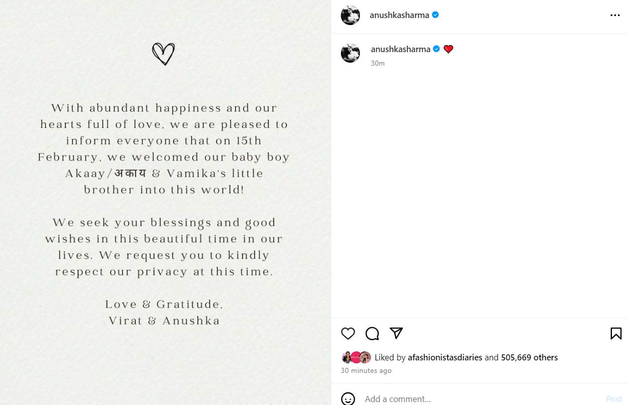 13 फरवरी को बिजनेसमैन हर्ष गोयनका ने सोशल मीडिया एक्स अकाउंट पर एक पोस्ट शेयर किया था, जिसमें उन्होंने लिखा था कि "अगले कुछ दिनों में एक नया बच्चा जन्म लेने वाला है। आशा है कि बच्चा सबसे महान क्रिकेटर पिता की तरह भारत को नई ऊंचाइयों पर ले जाएगा या यह मां को फॉलो करेगा और फिल्म स्टार बनेगा?" इसी के साथ हैशटैग मेड इन इंडिया और मेड इन लंदन भी लिखा था।