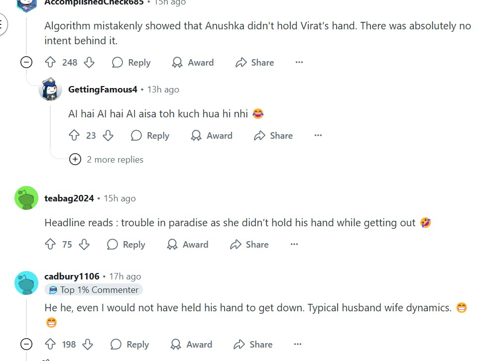 एक यूजर ने Reddit पर एक क्लिप पोस्ट की और दावा किया कि विराट और अनुष्का कल बेंगलुरु में देखे गए। अब क्लिप पर फैंस तरह-तरह के रिएक्शन दे रहे हैं। एक यूजर ने लिखा,"मैं क्या देख रहा हूं। उन्होंने विराट का हाथ नहीं पकड़ा।" एक अन्य एक्स यूजर ने लिखा, "अवनीत कौर वाले कांड के बाद भाभी गुस्सा है।" एक अन्य ने पोस्ट किया, "एल्गोरिदम ने हैंडशेक भी छोड़ दिया।"