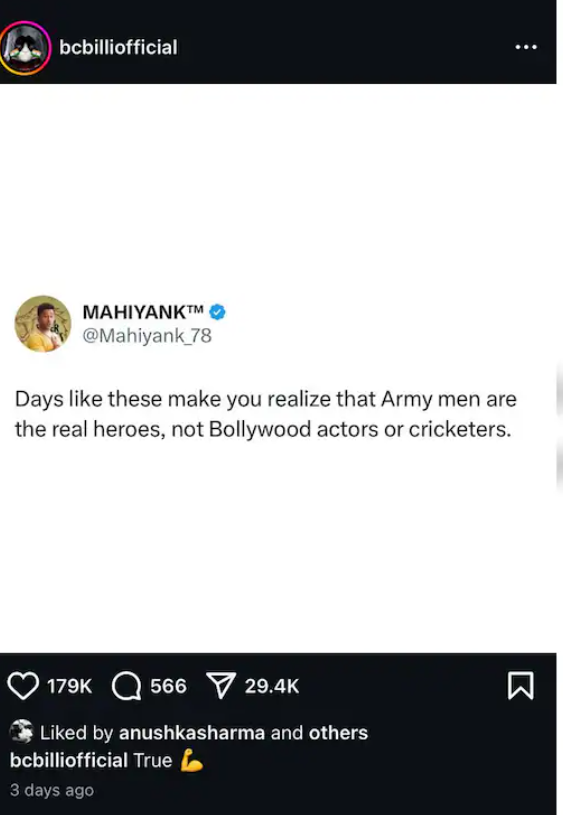 अब इन सबके बीच हाल ही में अनुष्का शर्मा ने एक और अनजान शख्स के पोस्ट पर रिएक्ट किया है। इस पोस्ट को महियांक नामक एक शख्स ने शेयर किया था। पोस्ट में शख्स ने लिखा था, "इस तरह के दिन आपको ये एहसास करवाते हैं कि आर्मी मैन रियल हीरोज हैं, बॉलीवुड एक्टर्स और क्रिकेटर्स नहीं हैं। उस शख्स की कही इस बात से अनुष्का सहमत नजर आईं और उन्होंने पोस्ट को लाइक किया। जो देखते ही देखते वायरल हो गया।