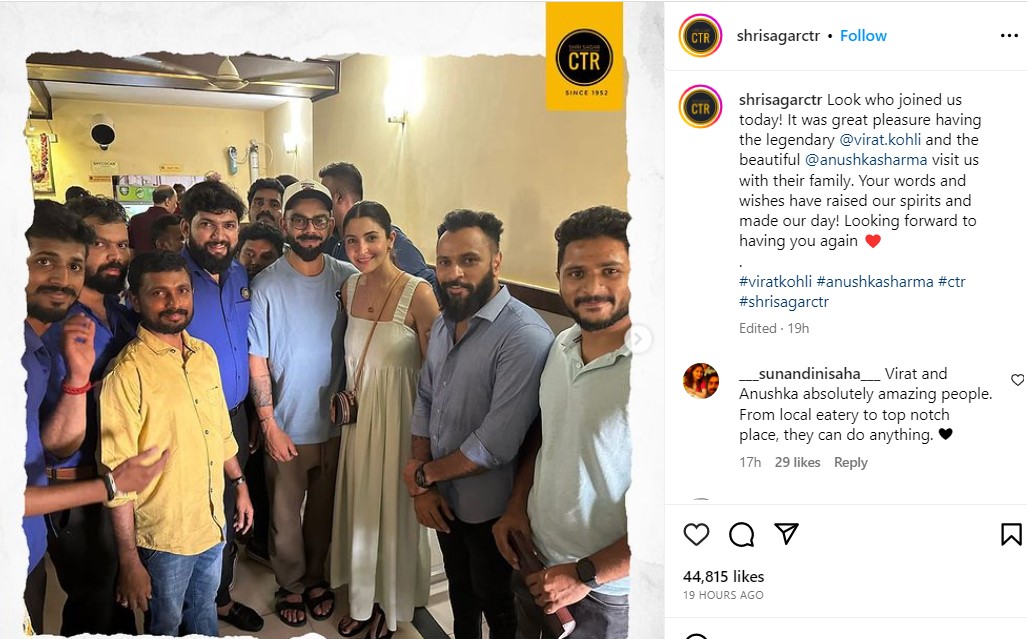 सेंट्रल टिफिन रूम (सीटीआर) के इंस्टाग्राम पेज से विराट-अनुष्का की कुछ अन्य तस्वीरें शेयर की गई हैं, जिसमें यह कपल वहां के स्टाफ के साथ पोज देते नजर आ रहा है।