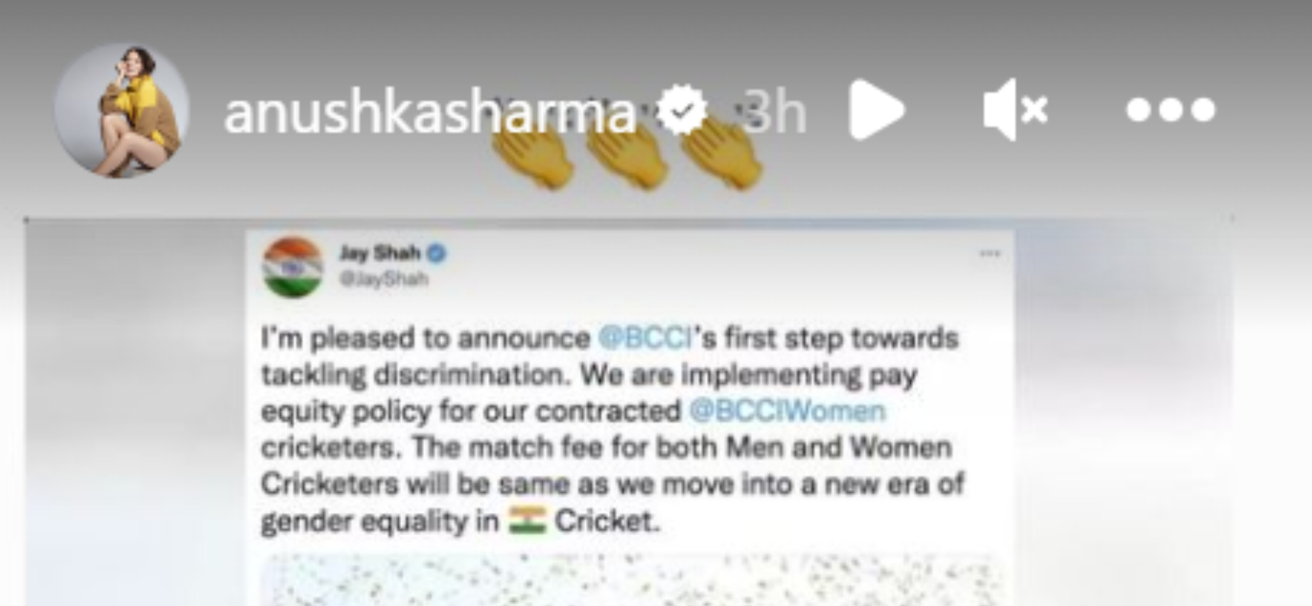 अनुष्का शर्मा ने जय शाह के ट्वीट को शेयर करते हुए ताली बजाने की इमोजी बनाकर इसे सपोर्ट किया। बता दें, अनुष्का क्रिकेटर झूलन गोस्वामी की बायोपिक चकदा एक्सप्रेस में झूलन का किरदार निभा रही हैं।