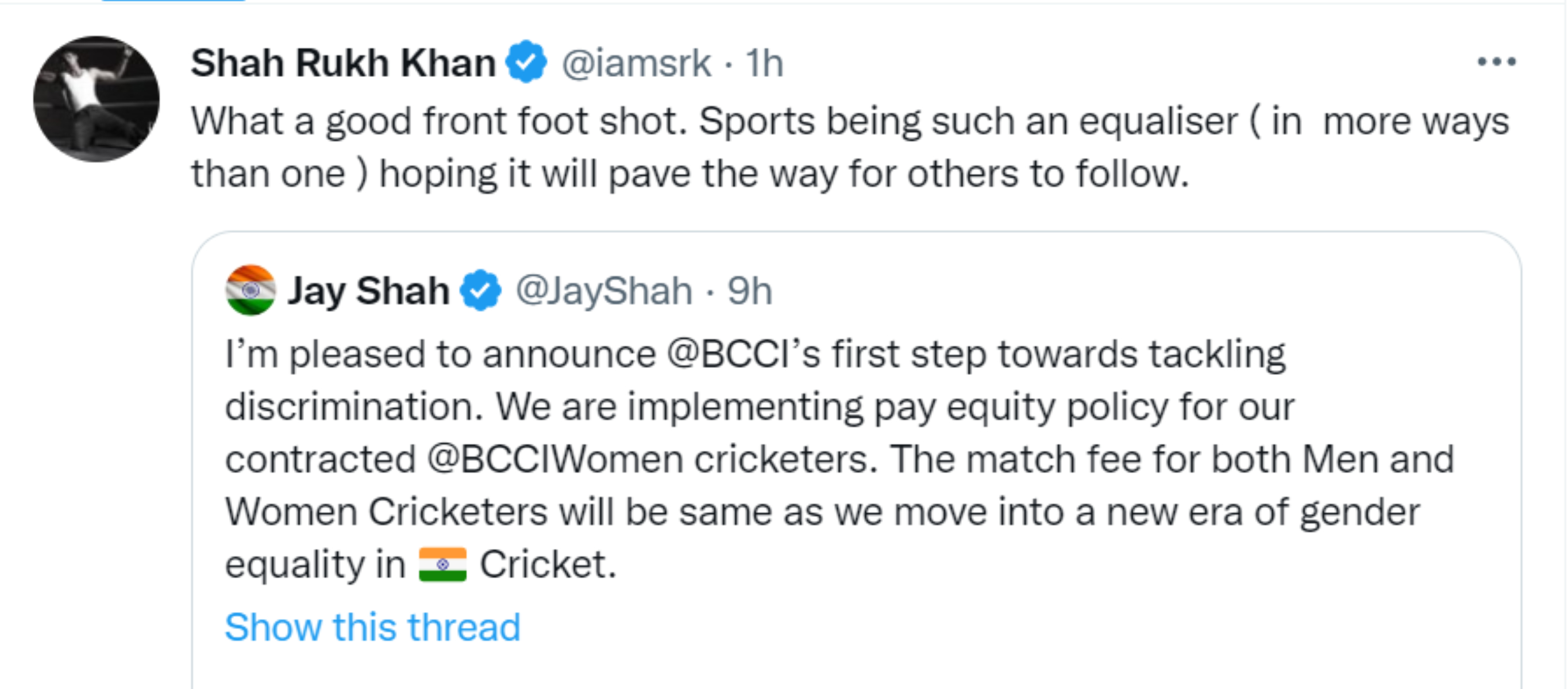शाह रुख खान ने लिखा- क्या बेहतरीन फ्रंट फुट शॉट है। खेल सबको समानता से देखते रहे हैं। उम्मीद है कि यह दूसरों को भी रास्ता दिखाएगा।