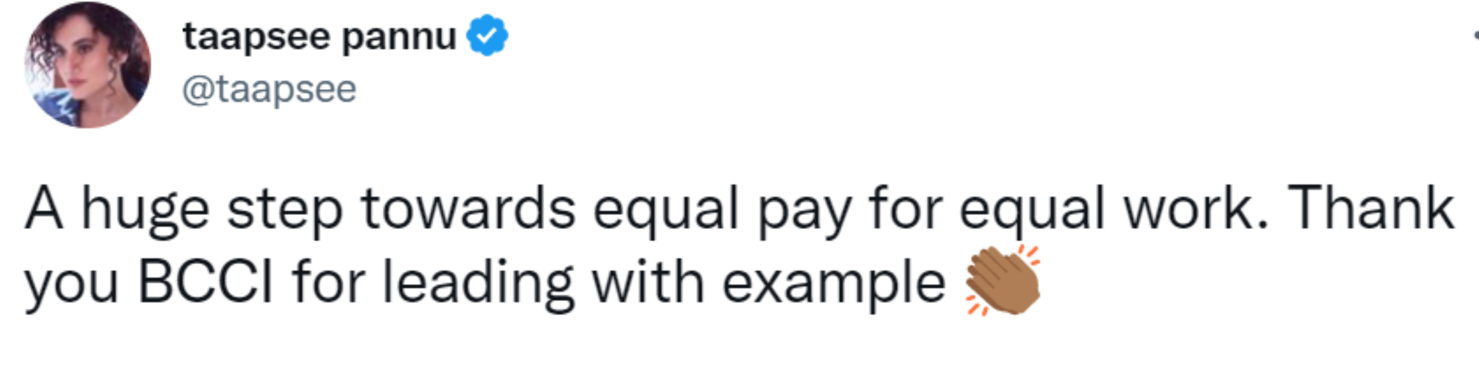पूर्व महिला क्रिकेटर मिताली राज की बायोपिक शाबाश मिथु में उनका किरदार निभाने वाली तापसी पन्नू ने ट्वीट करते हुए लिखा- समान काम के लिए समान फीस की दिशा में बड़ा कदम। मिसाल बनकर आगे रहने के लिए शुक्रिया बीसीसीआई।