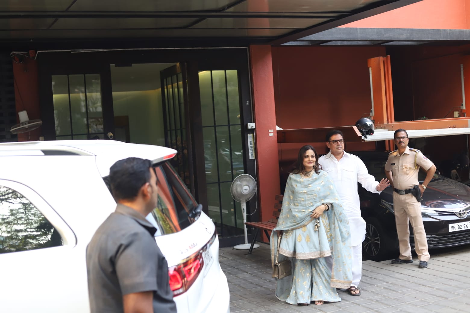 अर्पिता खान के घर अरबाज खान के पेरेंट्स भी पहुंचे है। इस खास मौके सलीम खान बेहद सिंपल लुक में नजर आए, लेकिन मां सलमा ग्रीन कलर के हेवी सूट में नजर आ रही है।
