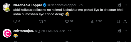 एक यूजर ने कमेंट करते हुए लिखा, "अबकी बार कोलकाता पुलिस ने नो-हेलमेट के लिए रोक दिया, तो शीरन भाई इंडिया हमेशा के लिए छोड़ देंगे"।