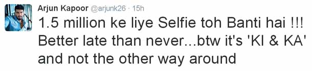 फॉलोअर्स की संख्या इतनी ज्यादा होने की खुशी में अर्जुन ने अपनी एक सेल्फी ट्विटर पर शेयर की। इसके साथ उन्होंने ट्वीट किया, '1.5 मिलियन के लिए सेल्फी तो बनती है। कभी न होने से बेहतर है देर हो जाना। वैसे वो कि एंड का है और कुछ नहीं।'
