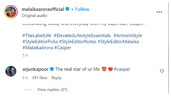 जैसे ही मलाइका अरोड़ा ने इंस्टाग्राम पर वीडियो शेयर किया, उसके बाद अर्जुन कपूर भी खुद को कमेंट करने से नहीं रोक पाए। उन्होंने कमेंट करते हुए लिखा 'आपके जीवन का असली सितारा, कैस्पर'। इसके बाद एक्टर ने एक और कमेंट करते हुए लिखा 'हैंडसम ब्वॉय'।