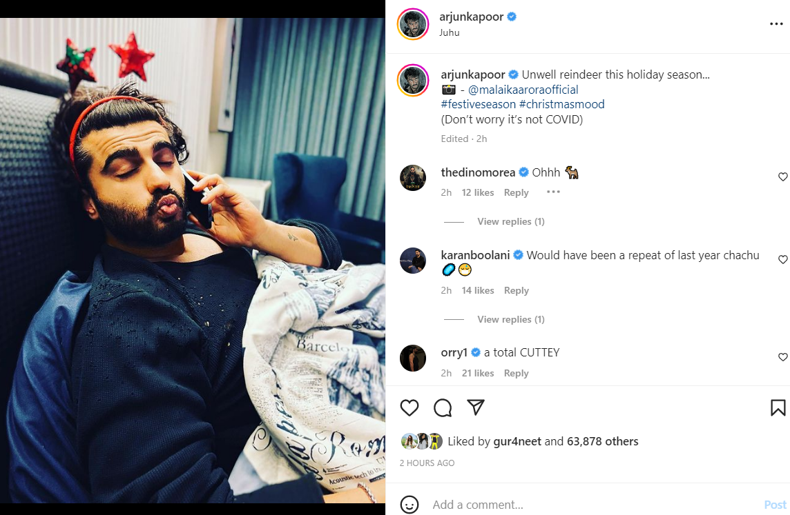 मलाइका हर साल क्रिसमस का सेलिब्रेशन बड़ी ही धूमधाम से करती हैं, क्योंकि उनकी मम्मी जॉइस पालीकार्प क्रिश्चन हैं। इस बार अर्जुन कपूर इस पार्टी का हिस्सा नहीं रहे। उन्होंने अपने इंस्टाग्राम पर एक फोटो शेयर की है जिसे मलाइका ने क्लिक किया है। इस फोटो में एक्टर किसी से कॉल पर बात करते नजर आ रहे हैं उन्होंने क्रिसमस-थीम वाले हेयर बैंड के साथ नजर आ रहे हैं। वह बिस्तर पर लेटे नजर आ रहे हैं और कैप्शन में लिखा- छुट्टियों के इस मौसम में अस्वस्थ... (चिंता न करें यह कोविड नहीं है)। इस पोस्ट से साफ हो गया है अर्जुन की तबीयत कुछ खराब है जिस कारण वह पार्टी में शामिल नहीं हुए।