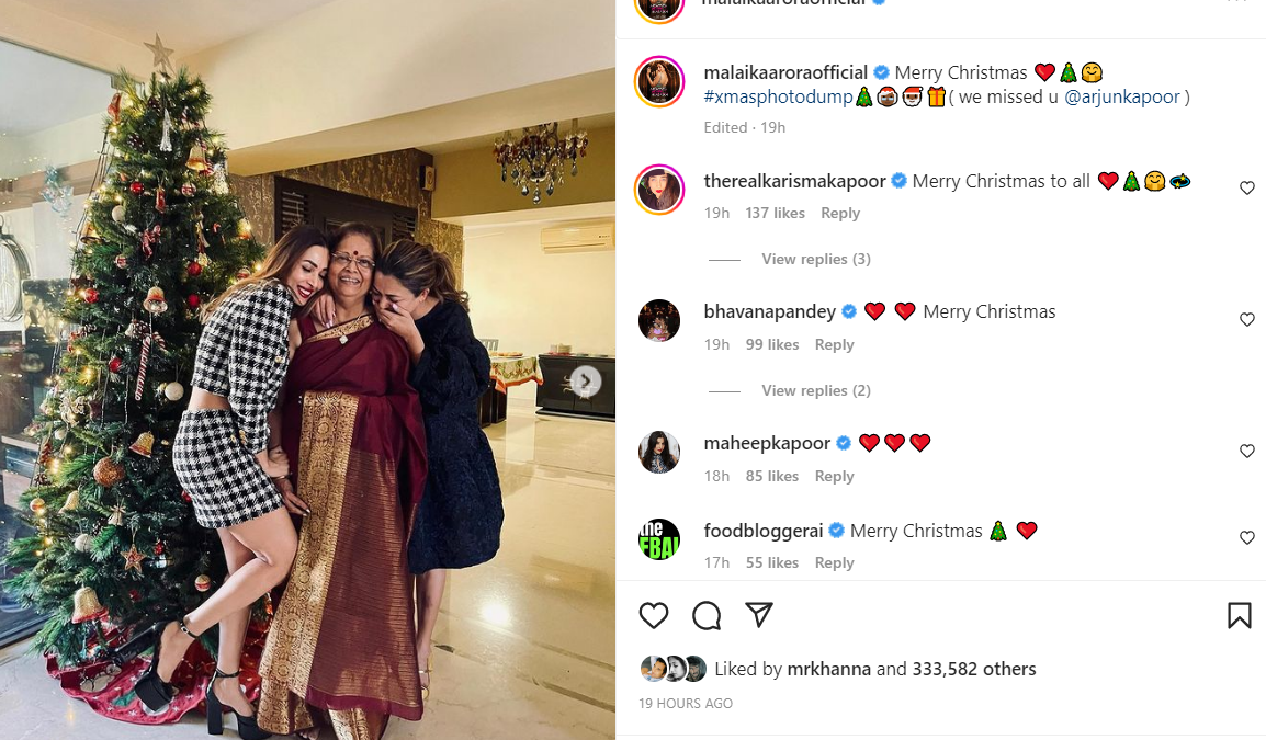 मलाइका अरोड़ा ने अपने इंस्टाग्राम पर मम्मी और बहन संग सेलिब्रेशन की तस्वीरे साझा की थी। इन तस्वीरों में बेहद खूबसूरत लग रही हैं। इस मौके पर मलाइका ब्लैक एंड वाइट को ऑर्डिनेट स्कर्ट में नजर आई। मलाइका ने अपनी मां के घर से कुछ तस्वीरें साझा की और लिखा, "मेरी क्रिसमस...हमने अर्जुन कपूर को बहुत मिस किया।