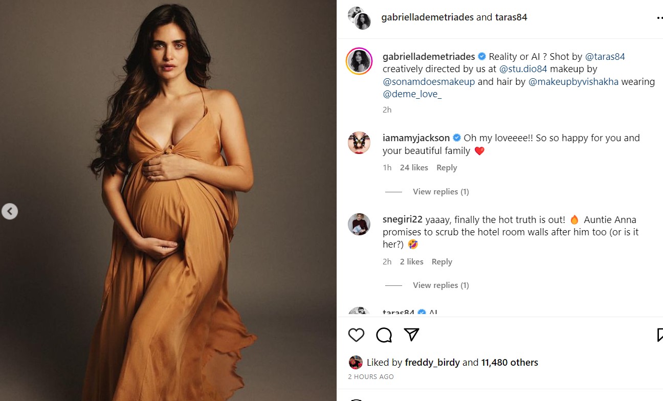 गैब्रिएला ने कुछ फोटोशूट कराए हैं, जिसके जरिये उन्होंने अपनी सेकेंड प्रेग्नेंसी की खुशखबरी फैंस और सेलिब्रिटी फ्रेंड्स के साथ शेयर की। इंस्टाग्राम हैंडल पर उन्होंने इन तस्वीरों को शेयर करते हुए कैप्शन में लिखा, 'रियलिटी या आर्टिफिशियल इंटेलीजेंस?' मैटरनिटी फोटोशूट से गैब्रिएला की तस्वीरें सामने आने के बाद कमेंट सेक्शन में उनके लिए बधाइयों का तांता लग गया है।