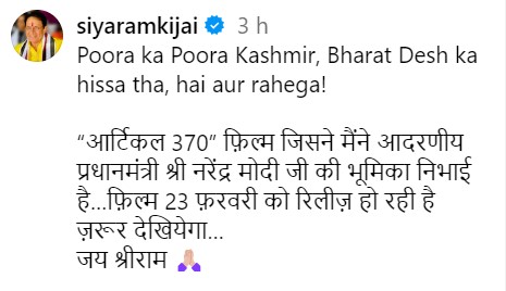 एक्टर ने अपने ऑफिशियल इंस्टाग्राम हैंडल पर शुक्रवार को एक लेटेस्ट फोटो को शेयर किया है। जिसमें वह पीएम मोदी के गेटअप में नजर आ रहे हैं। इस फोटो के कैप्शन में अभिनेता ने लिखा है- पूरा का पूरा कश्मीर भारत देश का हिस्सा था, है और रहेगा। फिल्म आर्टिकल 370 में मैंने आदरणीय प्रधानमंत्री नरेंद्र मोदी जी का किरदार अदा किया है। ये मूवी आने वाली 23 फरवरी को सिनेमाघरों में रिलीज होगी, ऐसे में इसे देखने जरूर जाएं, जय श्री राम।
