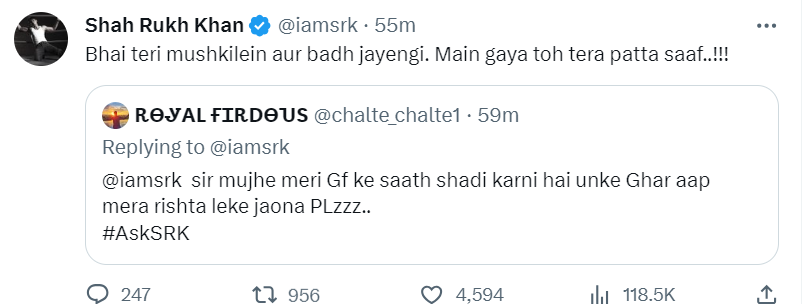 इसके अलावा एक फैन ने किंग खान से अपनी गर्लफ्रेंड को लेकर एक अजीब डिमांड भी की थी। उन्होंने कहा था कि, सर मुझे मेरी गर्लफ्रेंड के साथ शादी करनी है उनके घर आप मेरा रिश्ता लेके जाओ PLzzz। शाहरुख ने इस फैन को जवाब में लिखा, भाई तेरी मुश्किलें और बढ़ जाएंगी। मैं गया तो तेरा पत्ता साफ।