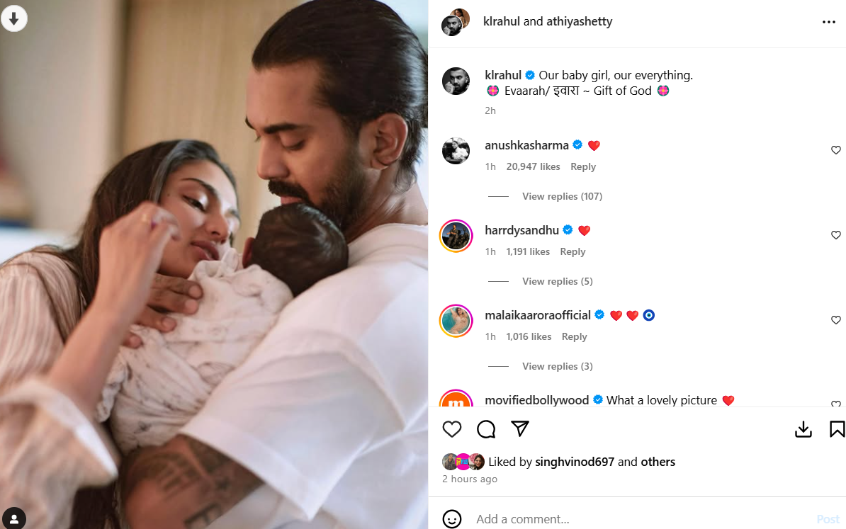 इस फोटो को शेयर करते हुए केएल राहुल ने कैप्शन में लिखा, "हमारी बेटी, हमारा सबकुछ है। इवारा-गिफ्ट ऑफ गॉड"। अथिया शेट्टी और केएल राहुल की बेटी के नाम का मतलब है 'भगवान का सबसे बड़ा तोहफा'।