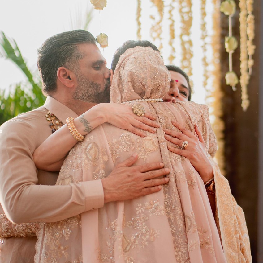 सुनील शेट्टी बेटी की शादी से एक और तस्वीर शेयर की है। इस तस्वीर में सुनील और माना बेटी को गले लगाकर प्यार जताते हुए दिख रहे हैं। अथिया को गले लगाए सुनील बेहद इमोशनल नजर आ रहे हैं और बेटी को किस कर रहे हैं। यहां देखें तस्वीर,