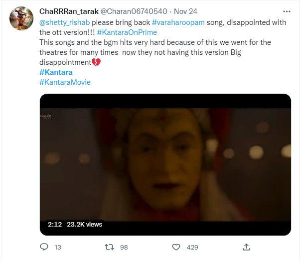 एक अन्य यूजर ने लिखा, 'कांतारा फिल्म की एक सोल थी, जिसकी वजह से ऑडियंस थिएटर्स तक जा रही थी। वह वजह थी वराह रूपम गाना और इस गाने का थिएट्रिकल एक्सपीरिएंस। लेकिन यह दुखद है कि #KantaraOnPrime पर हमे नए वर्जन को सुनना पड़ रहा है।'