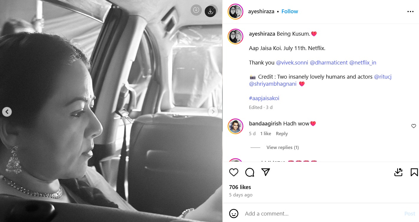 आर माधवनफातिमा सना शेख और आयशा रजा स्टारर आप जैसा कोई नेटफ्लिक्स पर रिलीज हो चुकी है। यह एक मल्टी कल्चरल फिल्म है। मूवी में नजर आ रही एक्ट्रेस आयशा र ...और पढ़ें