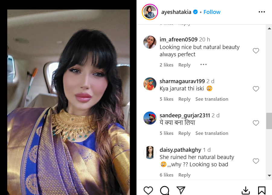 एक यूजर ने लिखा, 'आपने अपना चेहरा और नेचुरल ब्यूटी क्यों खराब कर ली? दूसरे ने कमेंट किया, 'ऐसी क्यों हो गई तुम इतनी प्यार थी'। तीसरे ने कमेंट किया, 'यह अपने आपको काइली जेनर समझती है'। एक अन्य ने कमेंट किया -'क्या जरूरत थी इसकी'।