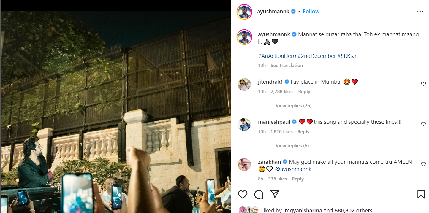 इस फोटो में आयुष्मान खुराना बॉलीवुड के किंग शाहरुख खान के घर 'मन्नत' के बाहर फैंस की भीड़ में नजर आ रहे हैं। उनकी आंखें 'मन्नत' को निहारती नजर आ रही हैं। आयुष्मान खुराना ने अपनी ये तस्वीर खुद सोशल मीडिया पर पोस्ट की है। इस फोटो के साथ एक्टर ने शानदार कैप्शन भी लिखा है- 'मन्नत से गुजर रहा था तो एक मन्नत मांग ली।' इसी के साथ उन्होंने #AnActionHero #2ndDecember #SRKian लिखा है। आयुष्मान खुराना के इस पोस्ट पर लोग मजेदार कमेंट्स कर रहे हैं। जारा खान ने लिखा है, 'ऊपर वाले आपकी सारी मन्नत पूरी करें।' एक्टर जितेन्द्र कुमार ने कहा है- मुंबई की फेवरेट जगह।