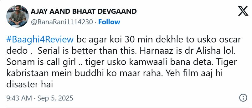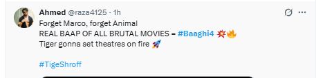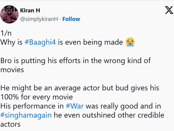 एक और यूजर ने निराशा व्यक्त करते हुए लिखा, "बागी 4 क्यों बनाई, ब्रो अपनी एनर्जी गलत फिल्म्स पर लगा रहा है। वह शायद एवरेज एक्टर होगा, लेकिन हर मूवी में अपना 100 % देता है। वॉर और सिंघम अगेन में उनकी परफॉर्मेंस शानदार है।