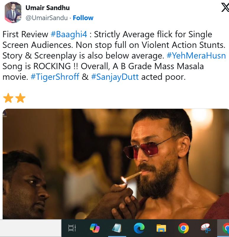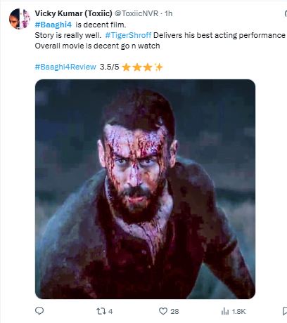दूसरे दर्शक ने फिल्म देखकर लिखा, "बागी 4 डिसेंट फिल्म है। कहानी अच्छी है, टाइगर श्रॉफ ने अपने करियर की सबसे बेस्ट एक्टिंग की है, आप जाइए और ये फिल्म देखिए"।