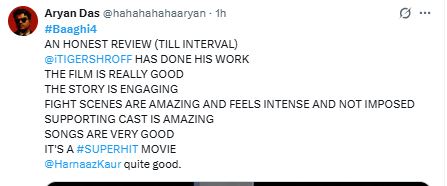एक और अन्य यूजर ने लिखा, "मैं आपको बागी 4 का ईमानदारी से रिव्यू दूंगा। टाइगर श्रॉफ ने अच्छा काम किया है। फिल्म बहुत ही अच्छी है। स्टोरी इंगेजिंग है। फाइट सीन काफी अच्छे हैं, जो इंगेज करते हैं, कहीं भी नहीं लग रहा कि ये थोपे गए हैं। सपोर्टिंग कास्ट ने अच्छा काम किया है, फिल्म के गाने बहुत ही बेहतरीन हैं"।