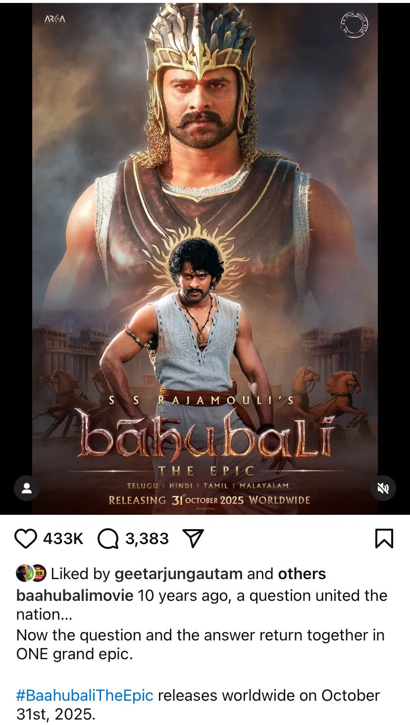 प्रभास के इस पोस्ट से ये साफ होता है कि बाहुबली पहले और दूसरे पार्ट की कहानी को अब एक ही मूवी के आधार पर थिएटर्स में दोबारा से रिलीज किया जाएगा। ऐसे में इसे तीसरे पार्ट (Baahubali 3) की अनाउंसमेंट से न जोड़ा जाए। हालांकि, बाहुबली की कहानी को अब बिना किसी ब्रेक के एक साथ देखने को नया अनुभव ऑडियंस को मिलने वाला है और री-रिलीज में फिल्मों की कमाई के रिकॉर्ड भी संकट मंडरा रहा है।