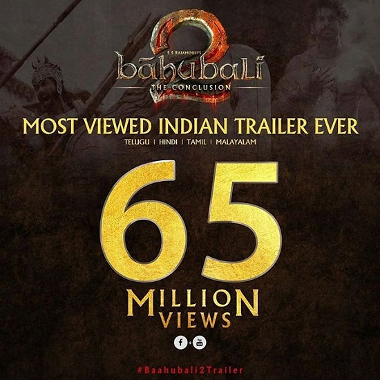 जी हाँ , एस एस राजमौली स्टारर फिल्म बाहुबली - द कंक्लूजन के वीडियो (ट्रेलर) ने 24 घंटे के भीतर देखे जाने का नया रिकॉर्ड बना लिया है। दुनिया भर में किसी वीडियो को 24 घंटे के भीतर देखे जाने में बाहुबली का ट्रेलर सातवें नंबर पर आ गया है। कुल व्यूव्ड आंकड़ों में बाहुबली ने 65 मिलियन यानि साढ़े छह करोड़ का आंकड़ा पहले ही पार कर लिया था और इस ट्रेलर ने अब यू ट्यूब में 13 स्थान से जम्प लेकर सातवां स्थान हासिल कर लिया है।