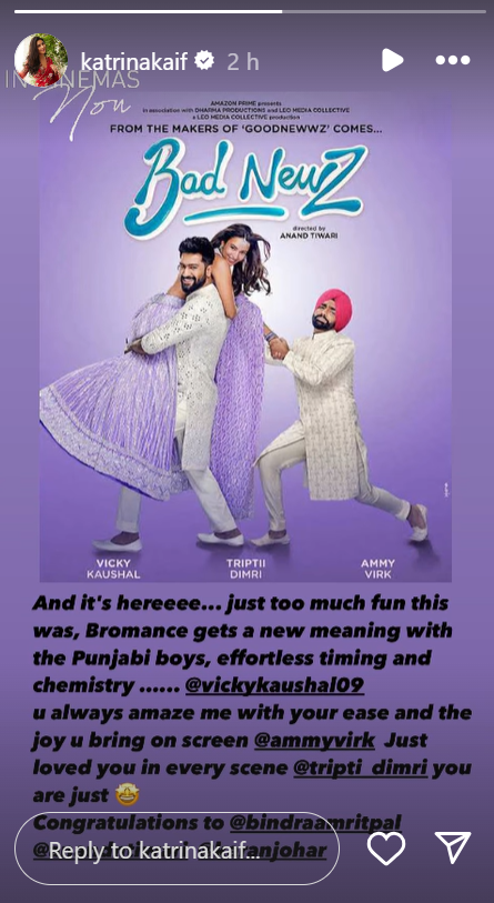 इसके आगे कटरीना ने विक्की की तारीफ करते हुए लिखा कि आप हमेशा अपनी सहजता से स्क्रीन पर जो खुशी लाते हैं, उससे मुझे आश्चर्यचकित करते हैं। इसके बाद उन्होंने एमी विर्क और तृप्ति की भी तारीफ की। एक्ट्रेस ने लिखा कि एमी आप हर सीन में छा गए और तृप्ति के लिए स्टार आई इमोजी शेयर किया।