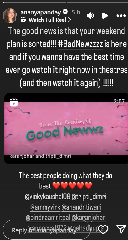 एक्ट्रेस अनन्या पांडे ने अपनी स्टोरी पर फिल्म का एक वीडियो शेयर किया और लिखा कि अच्छी खबर यह है कि आपका वीकेंड प्लान तैयार है। 'बैड न्यूज' आ गई है और अगर आप सबसे अच्छा समय बिताना चाहते हैं, तो अभी सिनेमाघरों में जाकर इसे देखें। इसके बाद उन्होंने टीम और कास्ट को टैग करते हुए लिखा कि सबसे अच्छे लोग वही कर रहे हैं जो वे सबसे अच्छा करते हैं।
