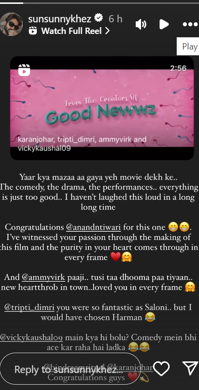 फिर उन्होंने आनंद तिवारी की तारीफ करते हुए लिखा कि इस फिल्म के लिए आपको बधाई। मैंने फिल्म के निर्माण के दौरान आपके जुनून को देखा है और आपके दिल की पवित्रता हर फ्रेम में झलकती है। एमी विर्क पाजी.. तुसी ता धूमा पा तियां, हर फ्रेम में आपको पसंद किया। तृप्ति डिमरी आप सलोनी के रूप में बहुत शानदार थीं, लेकिन मैंने हरमन को चुना होता। विक्की कौशल मैं क्या ही बोलू। कॉमेडी में भी ऐस कर रहा है लड़का।