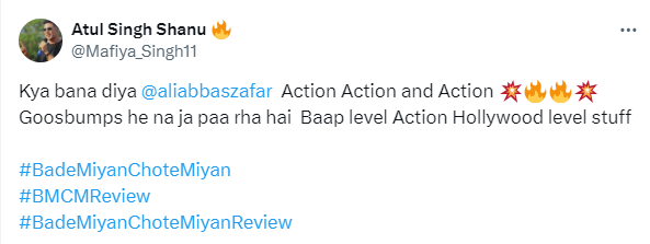 दूसरे यूजर ने अक्षय कुमार के एक्शन और अली अब्बास जफर के निर्देशन की तारीफ करते हुए लिखा, "अली अब्बास जफर क्या बना दिया, एक्शन-एक्शन सिर्फ एक्शन। गूजबंप जा ही नहीं रहे हैं, बाप लेवल एक्शन है एकदम"।