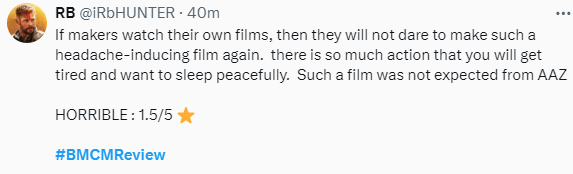 एक अन्य यूजर को फिल्म में इतना ज्यादा एक्शन बिल्कुल भी पसंद नहीं आया। फिल्म देखने के बाद दर्शक ने लिखा, "अगर मेकर्स खुद अपनी फिल्मों को देखेंगे, तो वह इस तरह की सिर दर्द वाली फिल्में नहीं बनाएंगे। फिल्म में इतना ज्यादा एक्शन है कि आप थक जाएंगे देखते हुए। अली अब्बास जफर से ये उम्मीद नहीं थी"।