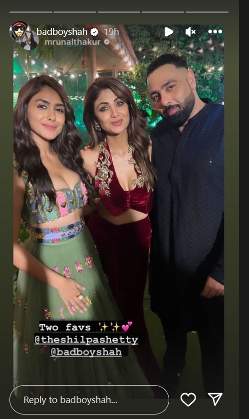 मृणाल ने अपनी इंस्टाग्राम स्टोरी पर बादशाह और शिल्पा शेट्टी के साथ तस्वीर शेयर किया। इसके कैप्शन में इन्होंने 'दो फेवरेट' लिखा। रैपर ने मेडल की स्टोरी को अपने अकाउंट पर रिपोस्ट किया है। इसी के साथ बादशाह और मृणाल का वीडियो इस पार्टी से वायरल हो रहा है।