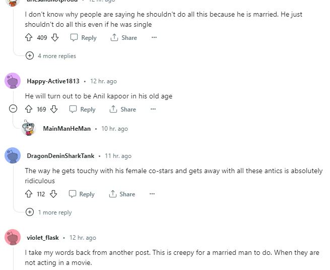 दूसरे यूजर ने लिखा, "मुझे ये नहीं समझ आ रहा कि लोग ये क्यों कह रहे हैं कि वह शादीशुदा हैं, इसलिए उन्हें इस तरह की हरकत नहीं करनी चाहिए, अगर वह सिंगल भी होते, तो भी उन्हें ऐसा नहीं करना चाहिए"। अन्य यूजर ने वरुण धवन को लताड़ लगाते हुए कहा, "जिस तरह से ये अपनी सभी को-स्टार्स के साथ टची होते हैं, ये बहुत ही गलत है"।