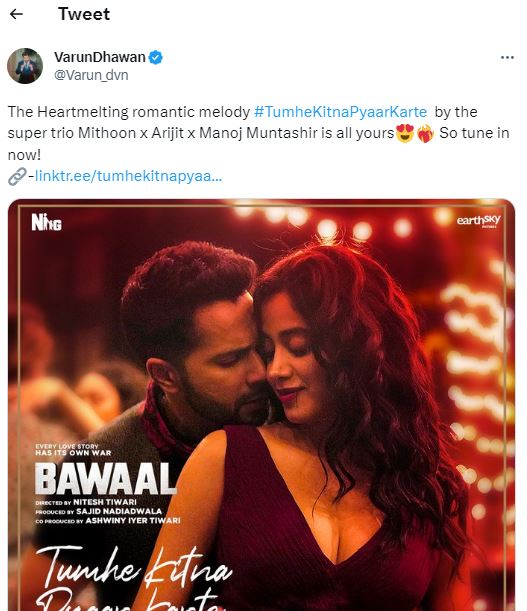 बवाल के इस ऑडियो ट्रैक को शेयर करते हुए मेकर्स ने कैप्शन में लिखा, "दिल को छू लेने वाला रोमांटिक मेलोडी 'तुम्हे कितना प्यार करते' रिलीज हो चुका है, जिसे सुपर ट्रायो मिथुन- अरिजीत सिंह और मनोज मुंतशिर ने बनाया है"।