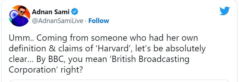 मोहम्मद ज़ुबैर ने अदनान सामी के एक पुराने ट्वीट का हवाला दिया जिसमें उन्होंने दावा किया था कि उनकी प्रतिभा बीबीसी द्वारा खोजी गई थी। सिंगर ने इसपर जवाब दिया, 'ये 1976 में हुआ था। वह एक अलग समय था और उसका राजनीति से कोई लेना-देना नहीं था और वह भी 2023 में और नहीं, इसने मेरी भारतीय नागरिकता में कोई भूमिका नहीं निभाई। आप निश्चित रूप से सही बनने की कोशिश कर रहे हैं। तो आप पहले थोड़े बड़े हो जाओ।